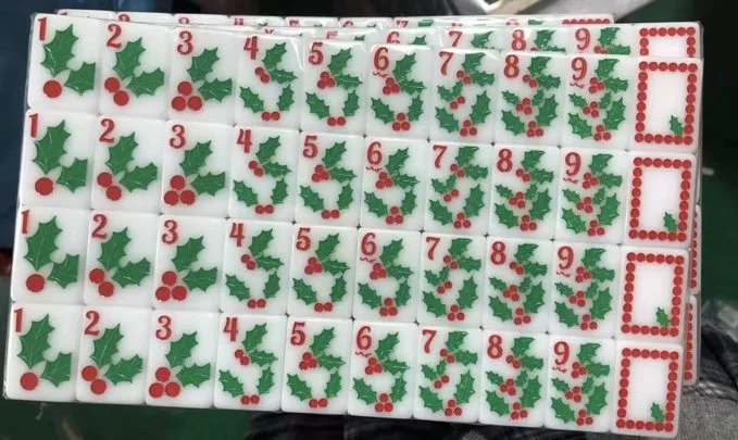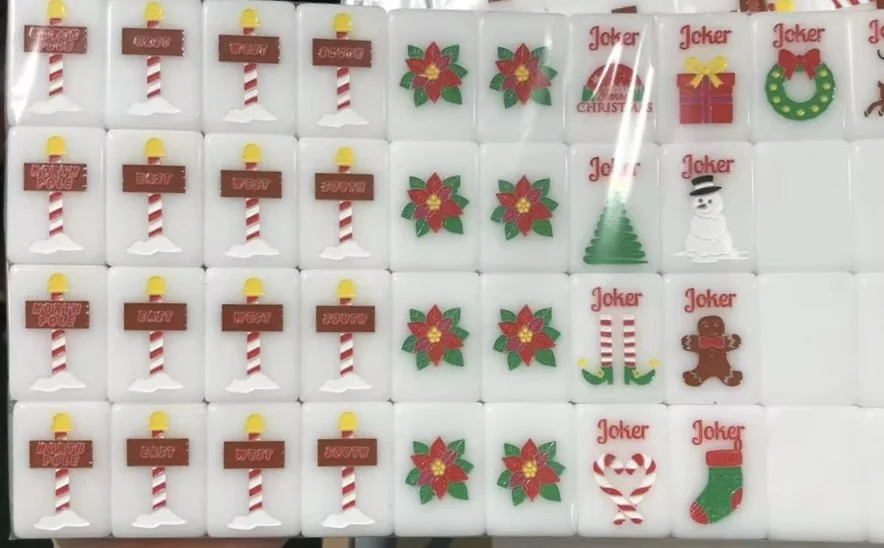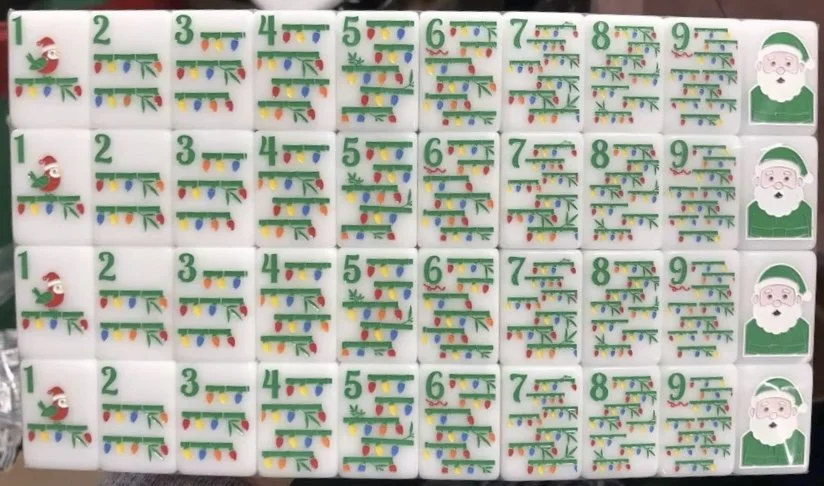 American/Chinese Mahjong tiles with Christmas designs. The Christmas Line comes in white acrylic tiles. All are engraved and hand painted. 1" x 1 7/16" x 7/16